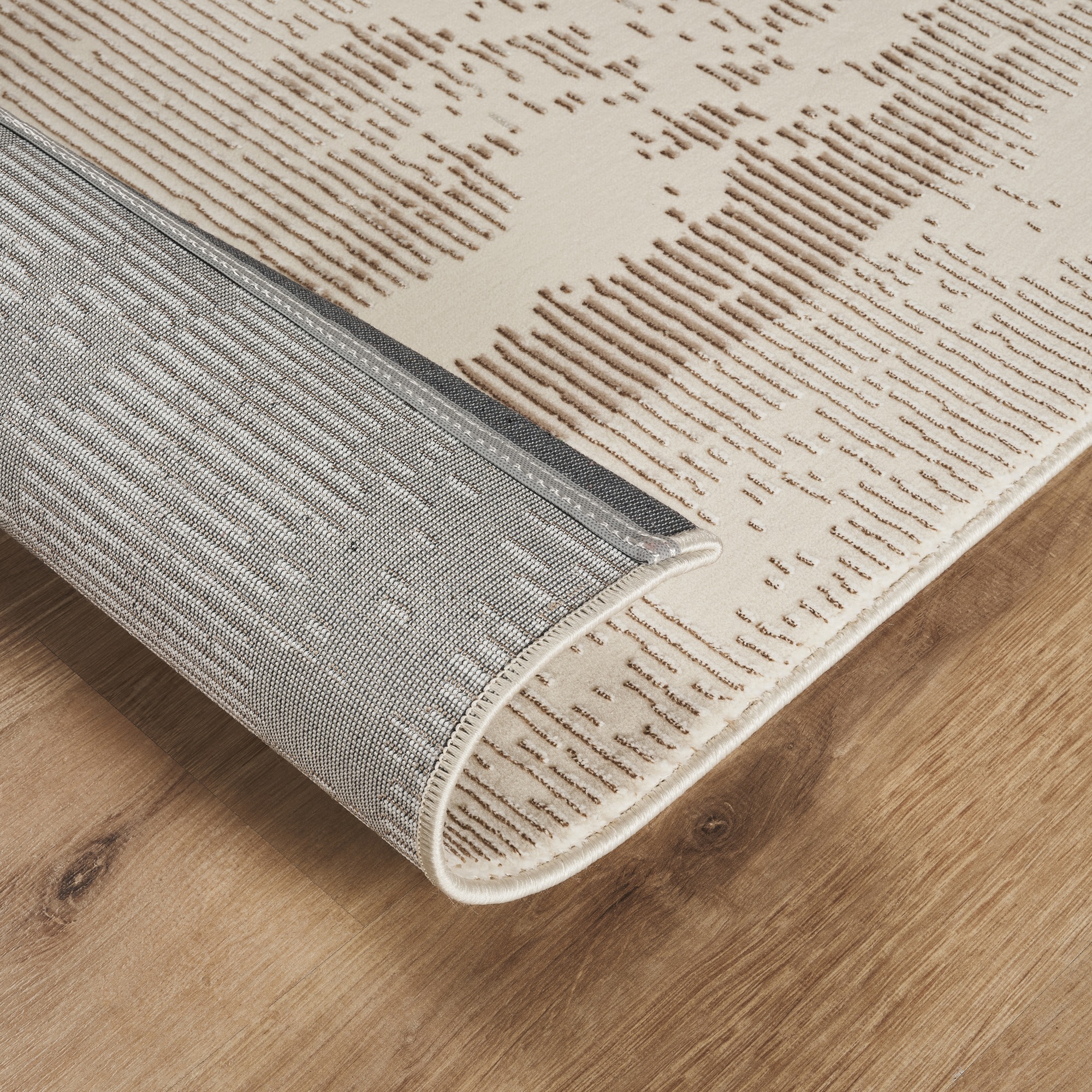 Dank seiner Vielseitigkeit ist dieser Teppich ein unverzichtbares Accessoire für jedes Zuhause. Wie auf dem Produktbild zu sehen, harmoniert er sowohl mit hellen als auch mit dunkleren Holzböden und lässt sich mit verschiedenen Möbel- und Einrichtungsstilen kombinieren.
